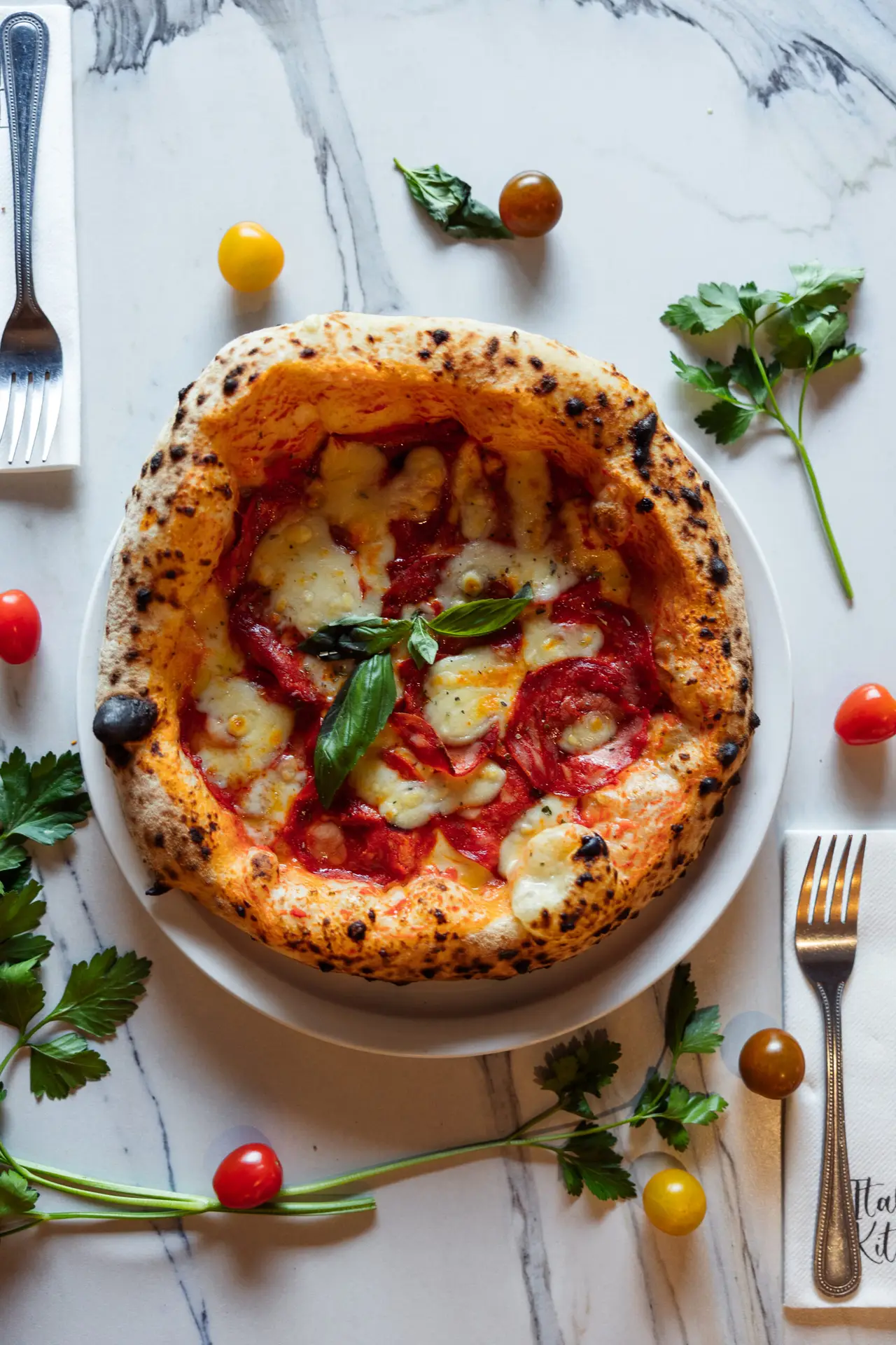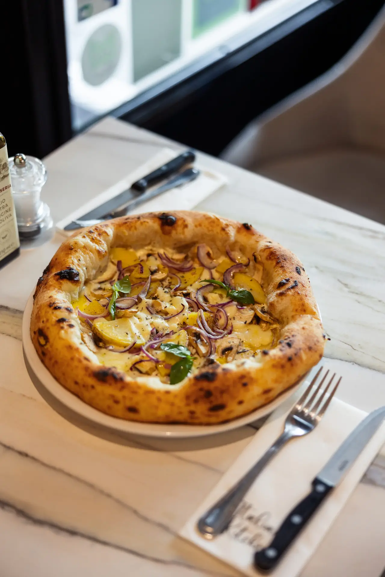 Crème fraîche, mozzarella fior di latte, poulet, oignons, champignons et pomme de terre